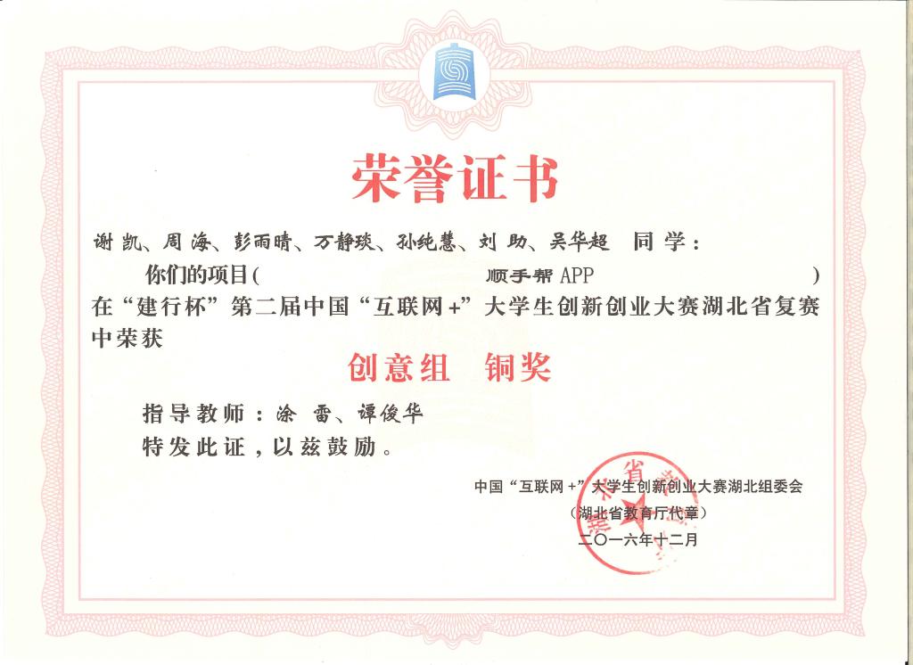“建行杯”第二届中国“互联网+”大学生创新创业大赛湖北省复赛-铜奖---顺手帮APP