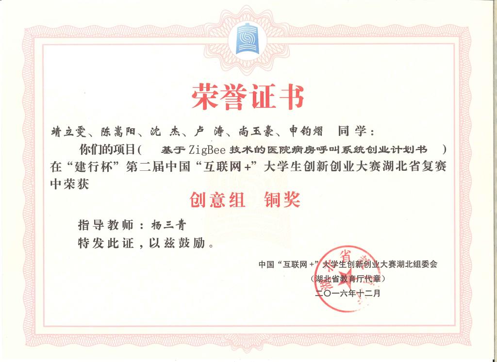 “建行杯”第二届中国“互联网+”大学生创新创业大赛湖北省复赛-铜奖---基于ZigBee 技术的医院病房呼叫...