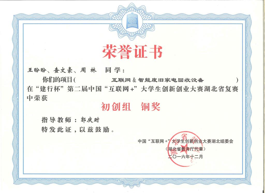 “建行杯”第二届中国“互联网+”大学生创新创业大赛湖北省复赛-铜奖---互联网&智能废旧家电回收设备
