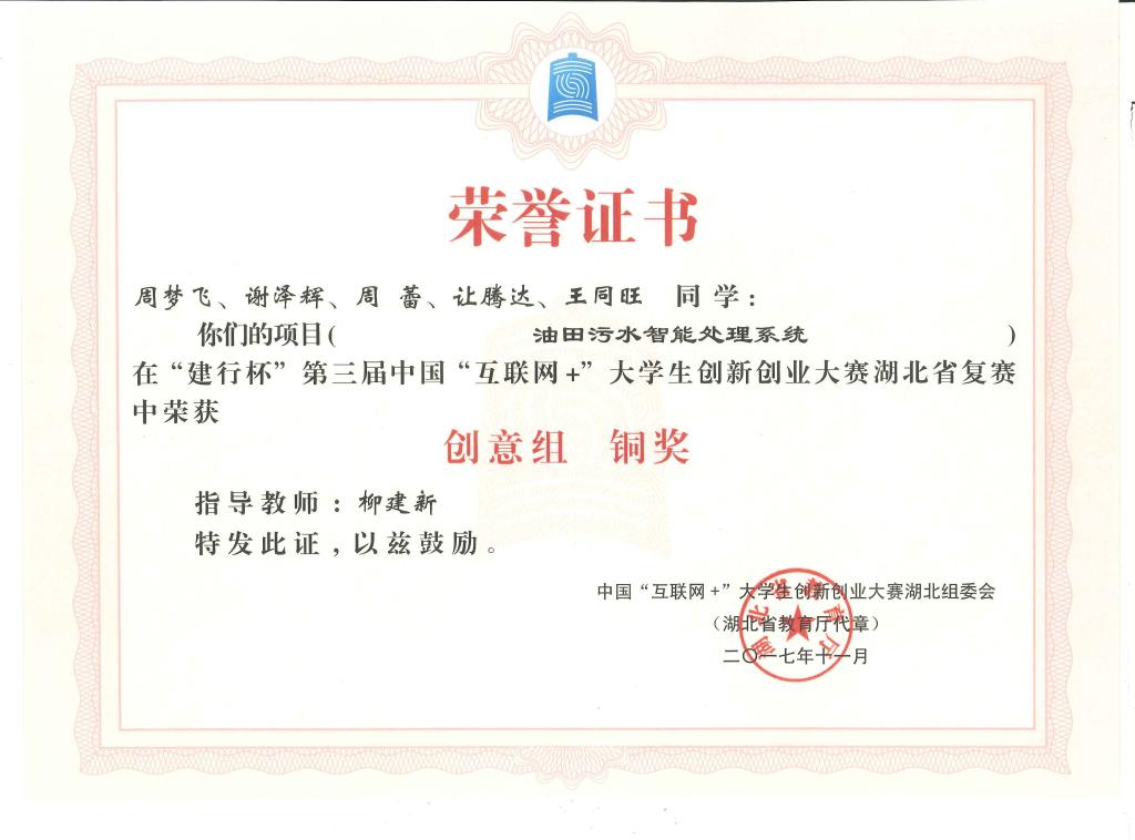 “建行杯”第三届中国“互联网+”大学生创新创业大赛湖北省复赛-铜奖---油田污水智能处理系统