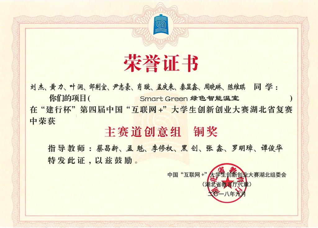 “建行杯”第四届中国国际“互联网+”大学生创新创业大赛湖北省复赛-铜奖---Smart Green 绿色智能温室