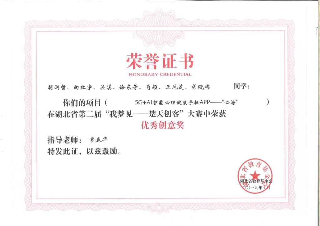 湖北省第二届“我梦见——楚天创客”大赛-优秀创意奖---5G+AI智能心理健康手机APP——心海