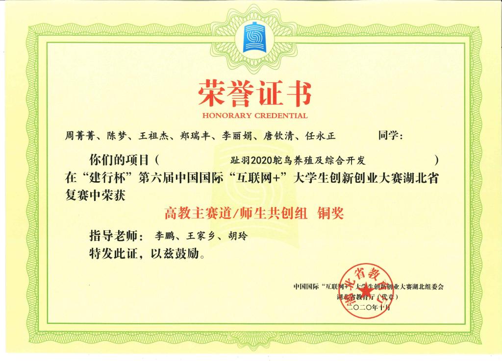 “建行杯”第六届中国国际“互联网+”大学生创新创业大赛湖北省复赛-铜奖---趾羽2020鸵鸟养殖及综合开发