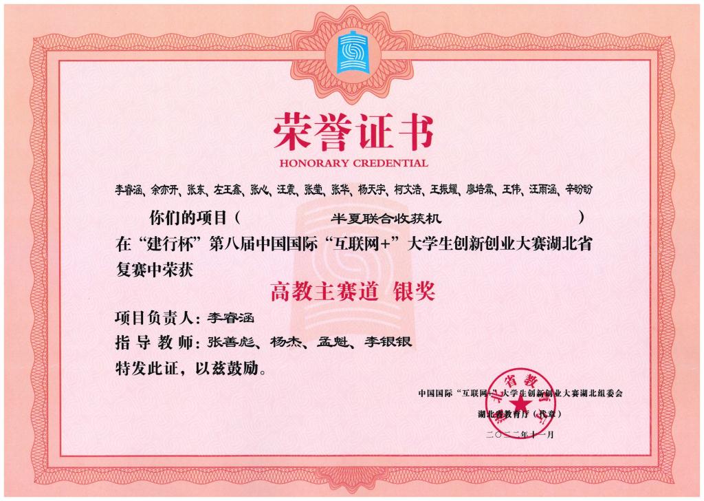 “建行杯”第八届中国国际“互联网+”大学生创新创业大赛湖北省复赛-银奖---半夏联合收获机