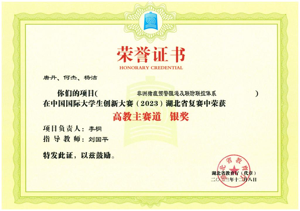 中国国际大学生创新大赛(2023)湖北省复赛-银奖---非洲猪瘟预警阻遏及联防联控体系