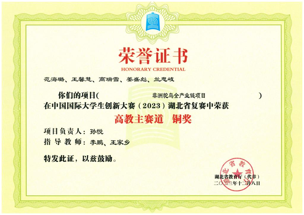 中国国际大学生创新大赛(2023)湖北省复赛-铜奖---非洲鸵鸟全产业链项目