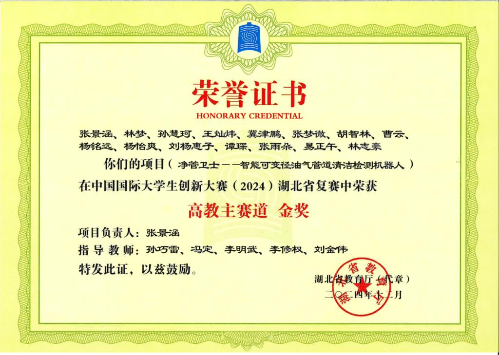 中国国际大学生创新大赛(2024)湖北省复赛-金奖---净管卫士——智能可变径油气管道清洁检测机器人