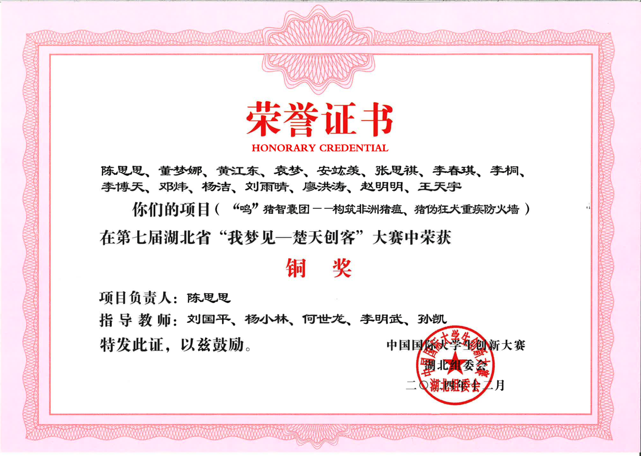 第七届湖北省“我梦见—楚天创客”大赛-铜奖---“鸣”猪智囊团——构筑非洲猪瘟、猪伪狂犬重疾防火墙