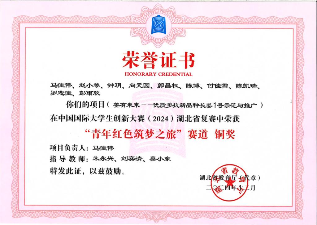 第七届湖北省“我梦见—楚天创客”大赛-铜奖---姜有未来——优质多抗新品种长姜1号示范与推广